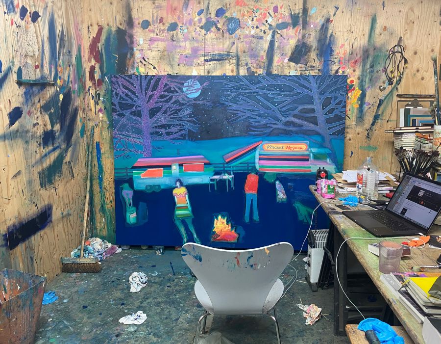 As soon as I entered my shack of a painting room I saw it was full of clouds of buzzing insects and fluttering moths of all colours, driven in by the breeze. It reminded me of my childhood, when insects were a summer phenomenon and a fact of life, but since then a rarer and rarer occurrence, so that now their fragile bodies are no longer spotted all over the car windscreen, front lights and bumper. As I continue now to struggle with this stubborn painting at 3:20 am, I paint with this company of creatures, fussing around the strip lights, becoming trapped in what’s left of my hair, and even crawling around my shirt under my mechanic’s discarded overalls which I wear when I know there is going to be a lot of paint flying about in desperation at trying to beat a picture into submission. And this painting is being particularly bolshy and I have painted it over and over like the Forth Road Bridge.