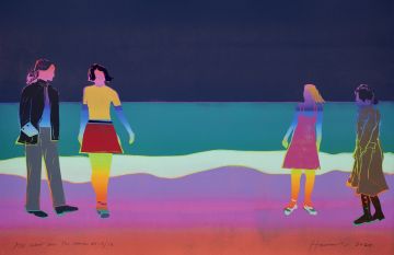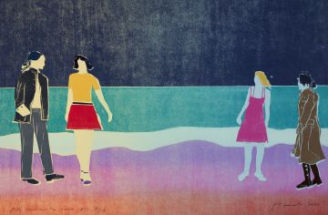 The title of All Men are the Same ( a two plate woodcut with hand painting) is taken from an aria in Mozart's Cosi Fan Tutte which Glyndebourne are reviving in their 2021 Festival. While the music is sublime I have always felt uncomfortable with the sexist and rather pernicious narrative in this opera where Fiordilidi's and Dorabella's loyalty towards their lovers Guglielmo and Ferrando are meanly tested and eventually bound to fail. So using this title, All Men are the Same, seems appropriately head on and combative. The woodcut is a very simple arrangement of figure and ground relationships, almost like an Indian miniature painting where the four main protagonists are set in front of the backdrop of the sea. Each man is looking at his friend's partner and in this simple symmetrical geometry of vision I have tried to allude to the complexities of the wife swopping plot — TH