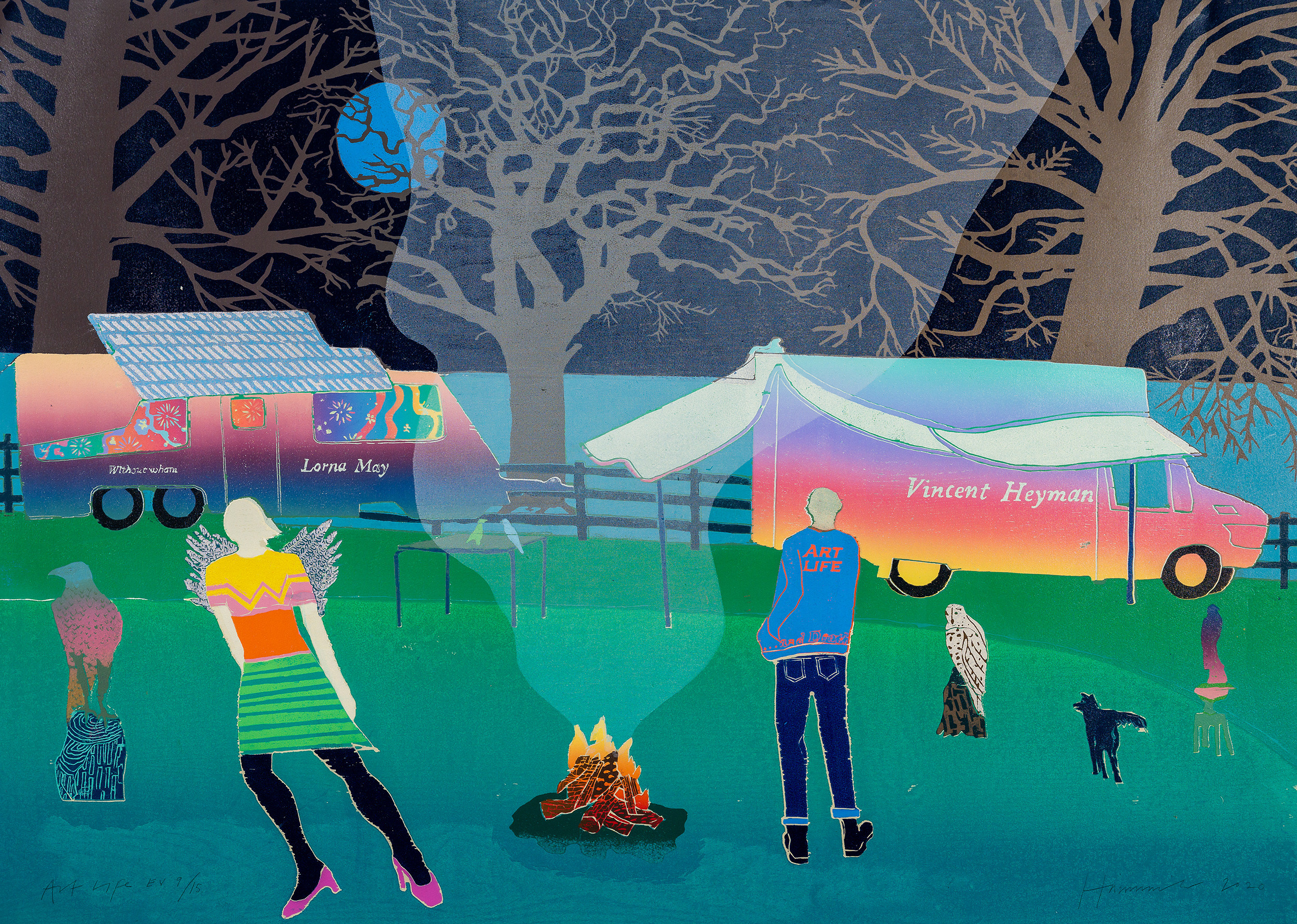 'Art Life' started when Tom was visiting his friend Sophie, who runs Hammick Editions. Out of his side window a white caravan and lorry had set up shop in a lay by by the side of the road. Smoke was rising from a little chimney and chain saw sculptures of birds and animals, some set on toadstools were arranged around the site. The woodcut, much more saturated in colour than the initial winter theme, acts as a metaphor for both the hardship of being an artist however “free” that might be and the grim reality for any relationship built round such impecunious making. Here the artist turns back to his mobile studio while his partner seems to be exiting stage left as quick as she can, while wearing a version of Clare Danes’ wings as Juliet in Baz Luhrman’s Shakespearean tragedy. His romanticism for her written out in italic script on their caravan publicly professes his love for her, "Lorna May Without Whom”, like a line from a country and western song. Perhaps this is all too painful to behold. – TH