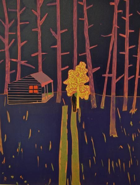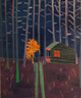 Burning Bush started as a drawing several years ago while on holiday in Brittany and mulled around in my head for ages. The painting (titled Cabin, see image here) took ages to make and became in the process an image more about an alter ego, living the simple life in the woods without responsibilities. It was also a Boy’s Own fantasy imagining an ideal working location for one’s practice. Island Studio is another image that is about this. TH