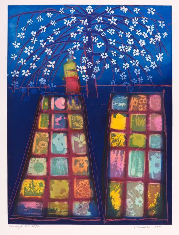 Canopy 11 was made at the same time as the painting Two Beds. (See image) Flowers from the garden, arranged like a magic carpet in two flower beds, look like photos on seed packets. A five plate etching, this was a very complicated etching to both make and print. TH