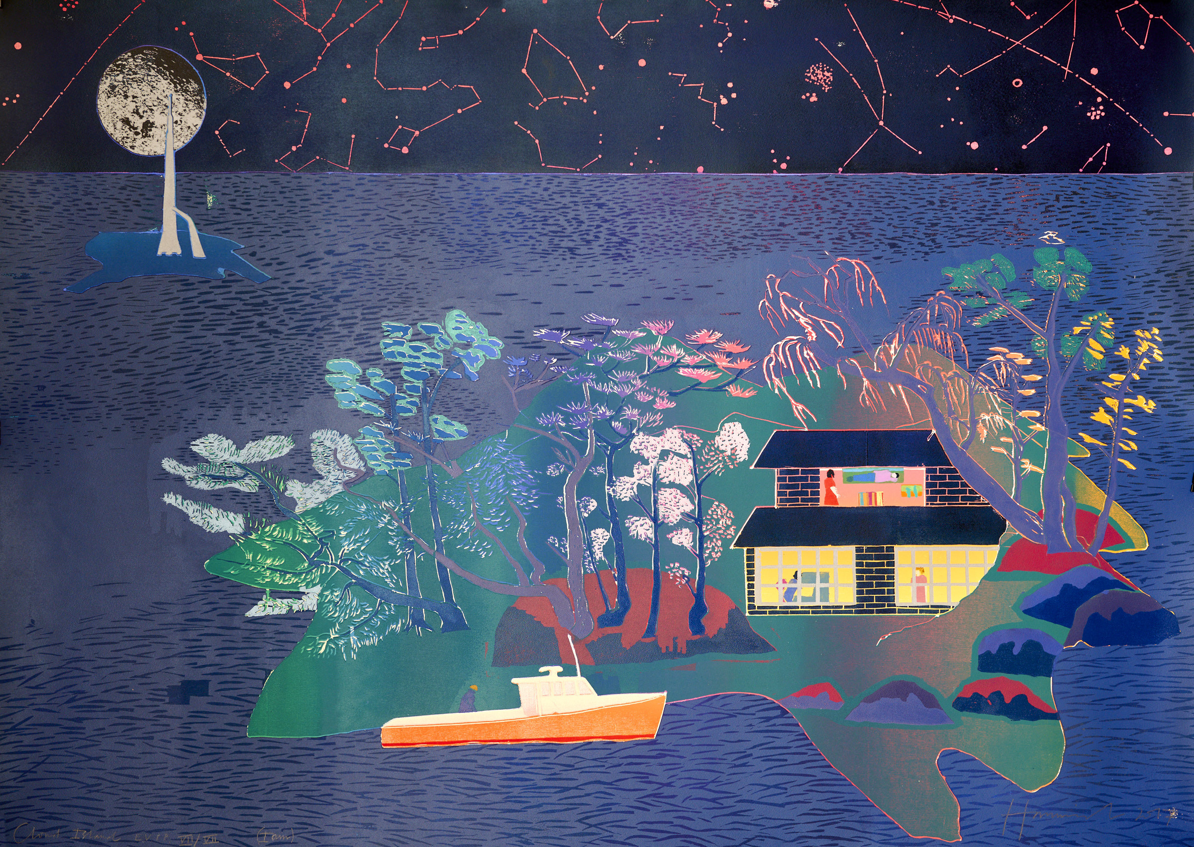 Cloud Island was made in Aberdeen at the Peacock Print Studio. In this rather Chinese and Confusion image of a shack amongst rocks and trees I wanted to try and find a metaphor for the world itself as a prelapsarian Eden. The question of why on earth the man in my picture is venturing out in his boat is perhaps linked in part to rage, the rage and wind in one's heart that comes with the territory of trying to make something from nothing while in essence it is a vanity - TH
