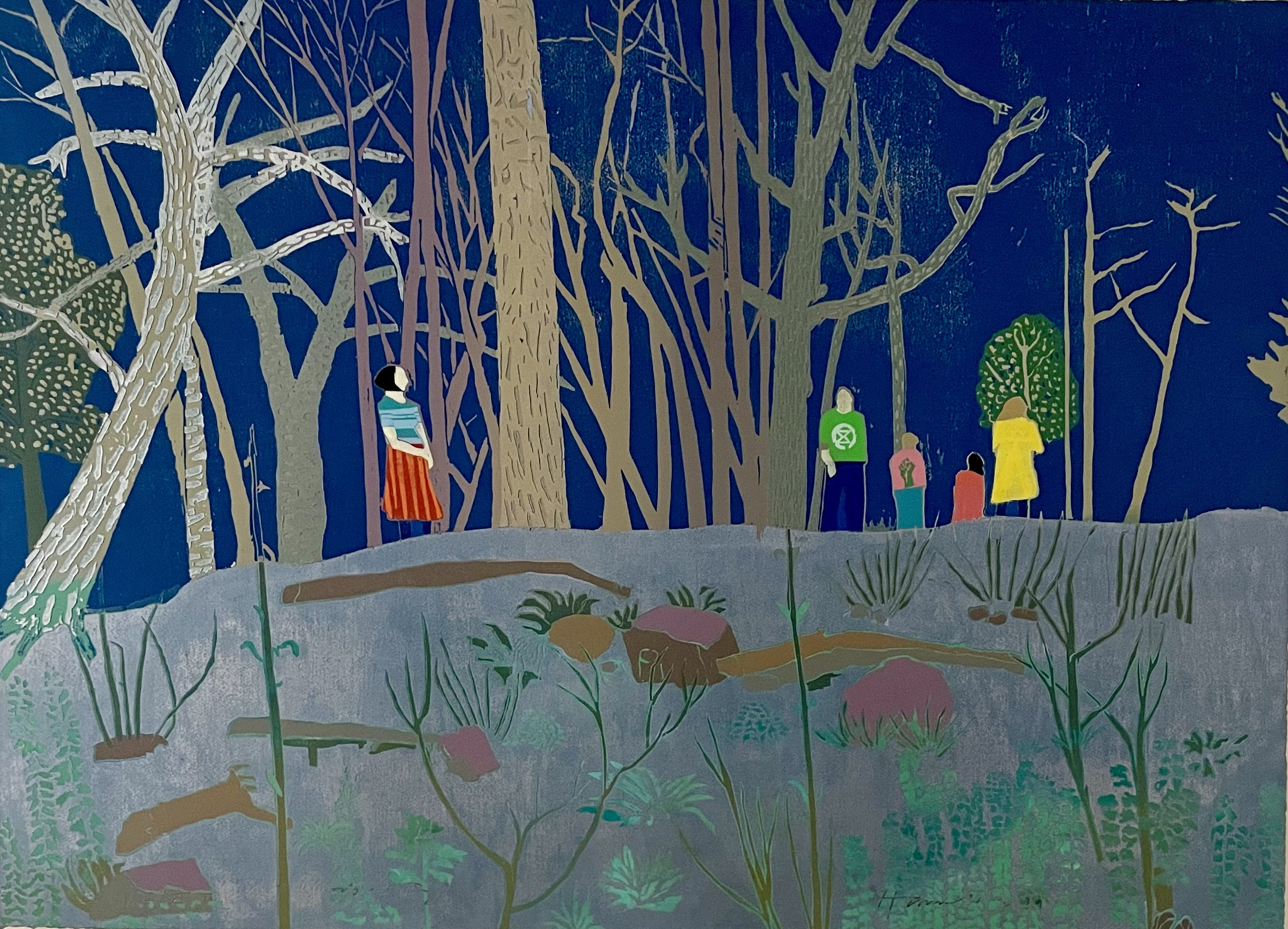 The wood-cuts I am making at the moment seem to be driven by a deep sadness for how completely out of sync we are with the natural and semi-natural world. But rather than make images of desertification leached eco-systems, clear-cutting bush fires, unoxygenated water courses and so-on, my current instinct is to try and celebrate the beauty in what we do have. Yeats put it so succinctly when he wrote 'I find under the boughs of love and hate, In all poor foolish things that live a day, Eternal beauty wandering on her way'. Here a part of a family, like members of a nomadic tribe, are about to enter the deep forest which has been coppiced in the foreground. Their parting reminds me of the inevitability of how, as a parent, it is painful to witness our children walk out into the world – TH