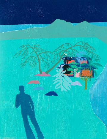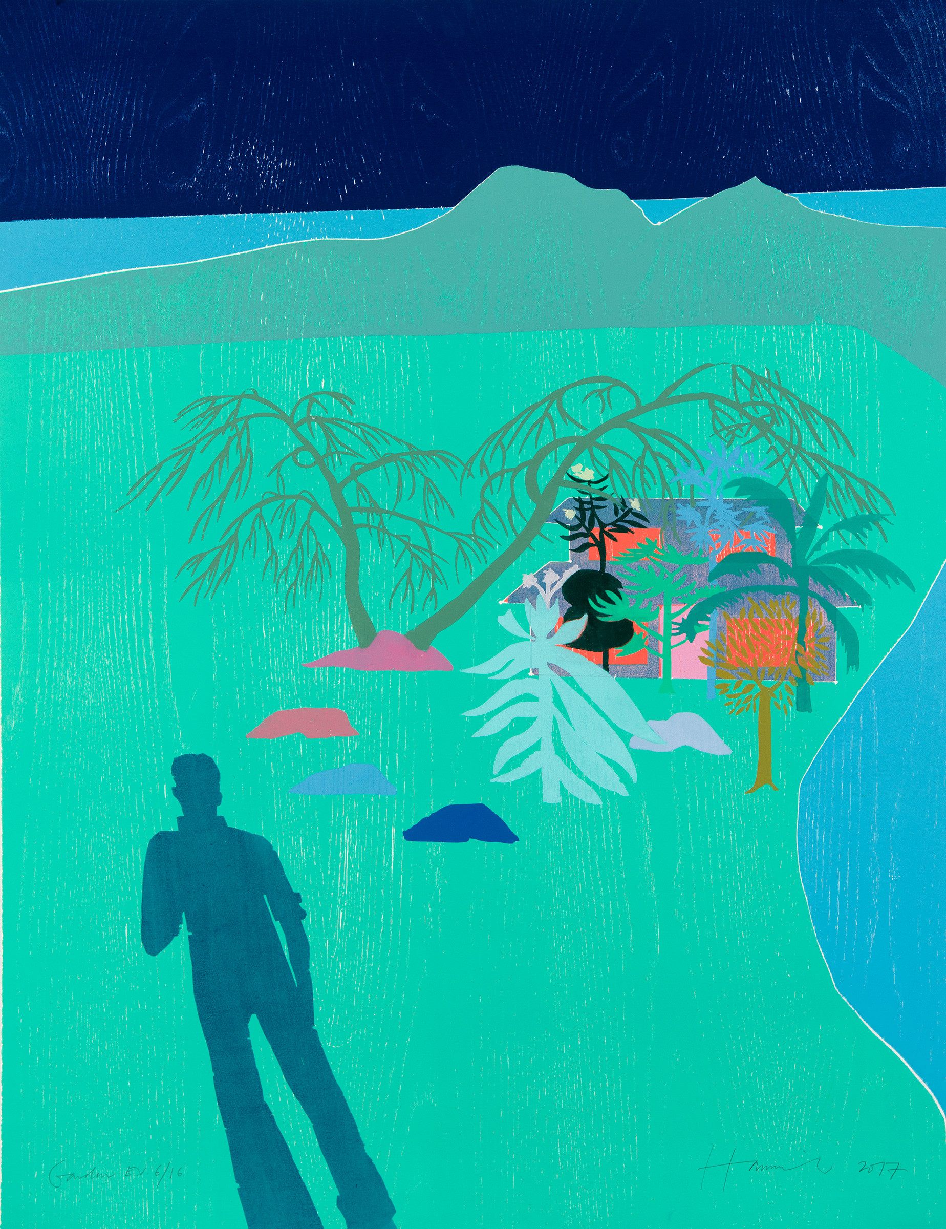 Garden was made as one of the final images in my Lunar Voyage epic narrative, a modern day odyssean voyage to The Moon and back as a series of 17 woodcuts narrating an existential journey towards enlightenment. Only by leaving does our anti-hero discover the boundless love and edenic wonder he has left behind on Earth, to the backdrop of an understanding that our planet is a miracle of delicious life tucked away in our particular corner of the cosmos. Here the cosmonaut returns to his garden, younger than when he left, and finds it so overgrown that the home he has left behind, like in the Sleeping Beauty myth, is almost impenetrable. The storylines of Lunar Voyage fold and meander into each other so that time becomes inside out and events of his leaving and returning interweave in the imagery. A world full of adventure, premonitions, heroic decisions, (very much akin to and inspired by those of the NASA programme in the 60’s of endeavour backed up by sophisticated kit) regret and yearning - TH