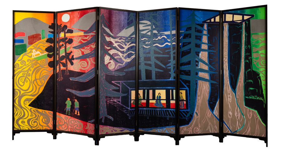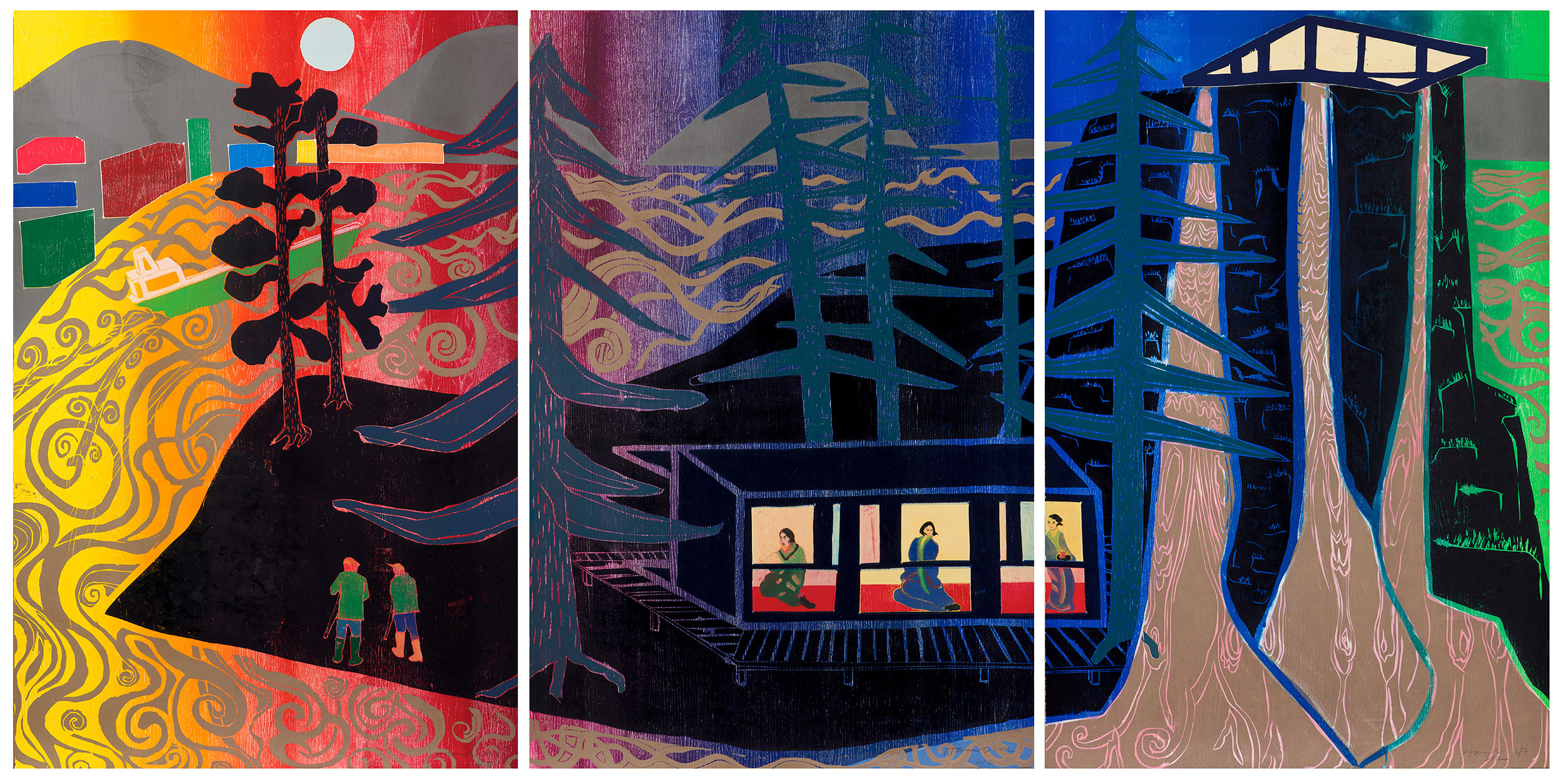 This woodcut was made in response to reading Po Chi-i's moving account of living the simple life in a pavilion on the slopes of Mt Lu, written over 1,100 years ago; and seeing Ogata Korin's sumptuous Red and White Plum Tree folding screen painting, c 1712. The studio in this image, set on an island overlooking a city on the other side of the water, is both an idealization of a cabin retreat set in the wilderness, and acts as a positive metaphor for an existence lived on the edge of society. From such a vantage point, looking in on the world from the outside, this picture is quite a personal account of the position I find myself in; being a somewhat detached observer as artist as well as attempting to keep a family together in the process.