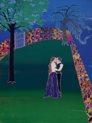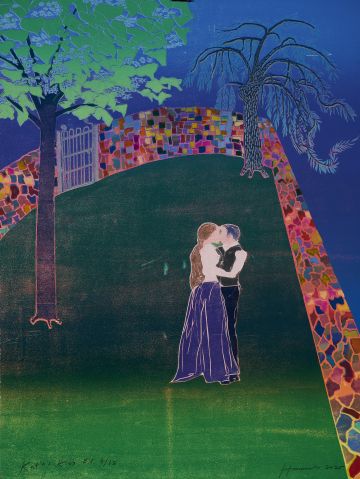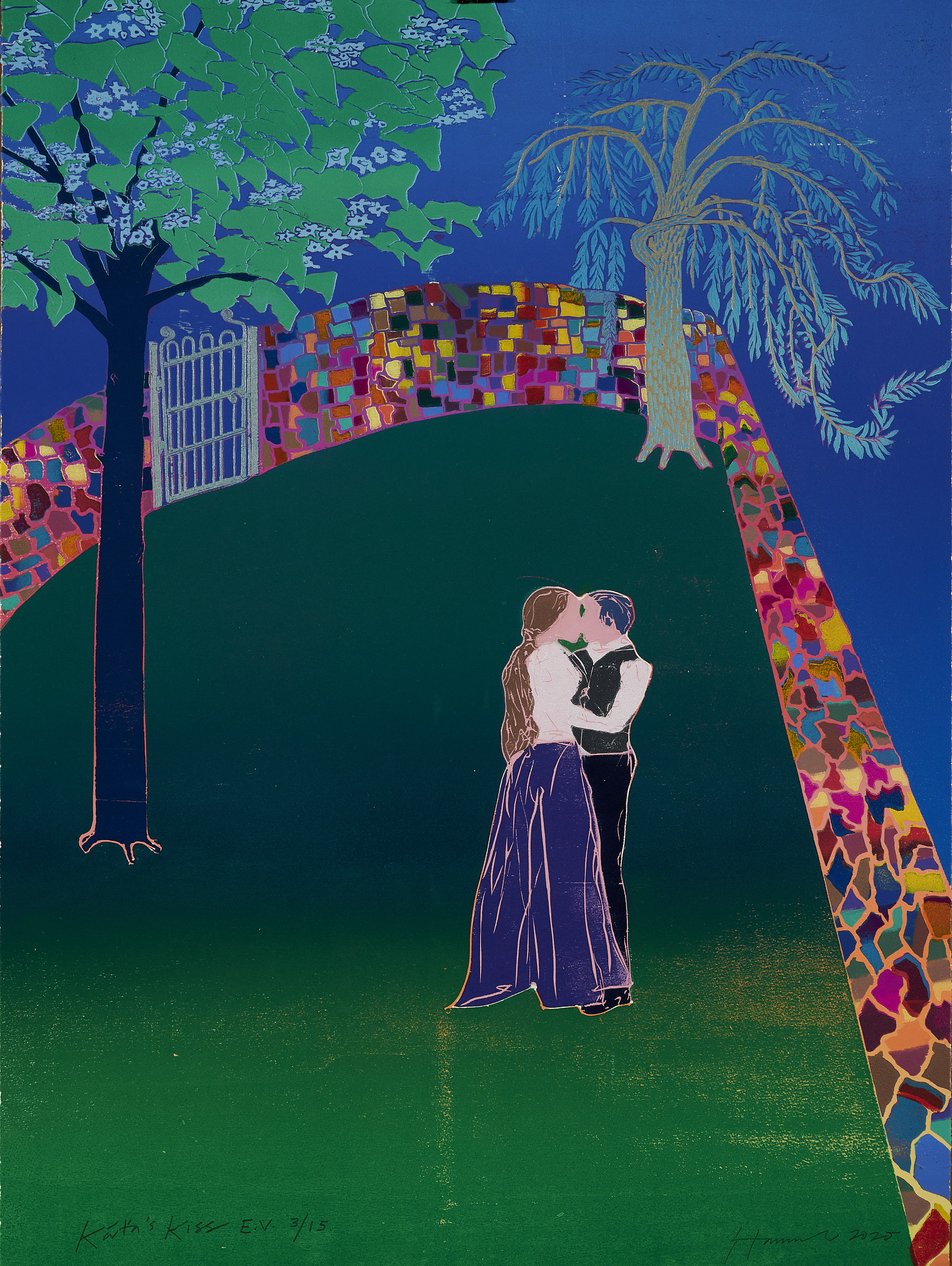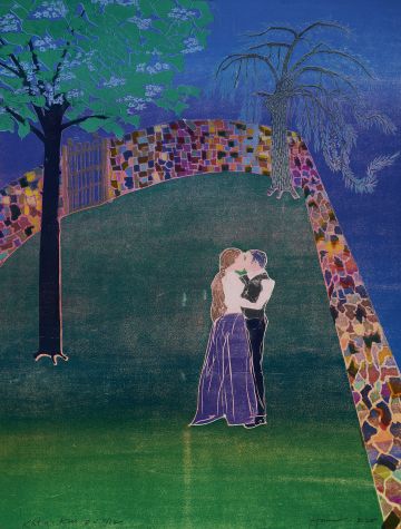 This woodcut has been made in response to Janaček's Kát'a Kabanová which Glyndebourne Festival Opera are putting on as a new production in their 2021 Festival. Káta's bland husband, Tithon has left on a business trip and she finds herself finally united with Boris Grigorjevč, a young man who has held a flame in her heart since before her marriage. In this woodcut, like both Brancusi's and Munch's versions of their works with the same title, here the lovers to be are joined in body and spirit, their faces and clothing merged into one; they stand at the end of a secret walled garden surrounded as a premonition by the River Volga. The kaleidoscopic coloured wall is a synesthetic device to conjure up the passion in their hearts — TH