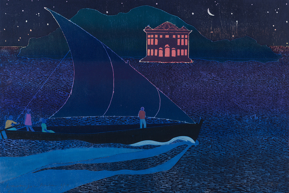 Konstanze's Freedom is a woodcut almost in symmetry to be seen with Konstanze at the Window. Here our heroine along with her maidservant, Blonde, and her husband, Belmonte along with his man servant, Pedrillo (who is incidentally Blonde's amore) are escaping lickityspit from Pasha Selim's harem which you can see in the background as a crown shaped villa on the headland. They are sailing into their future. - TH