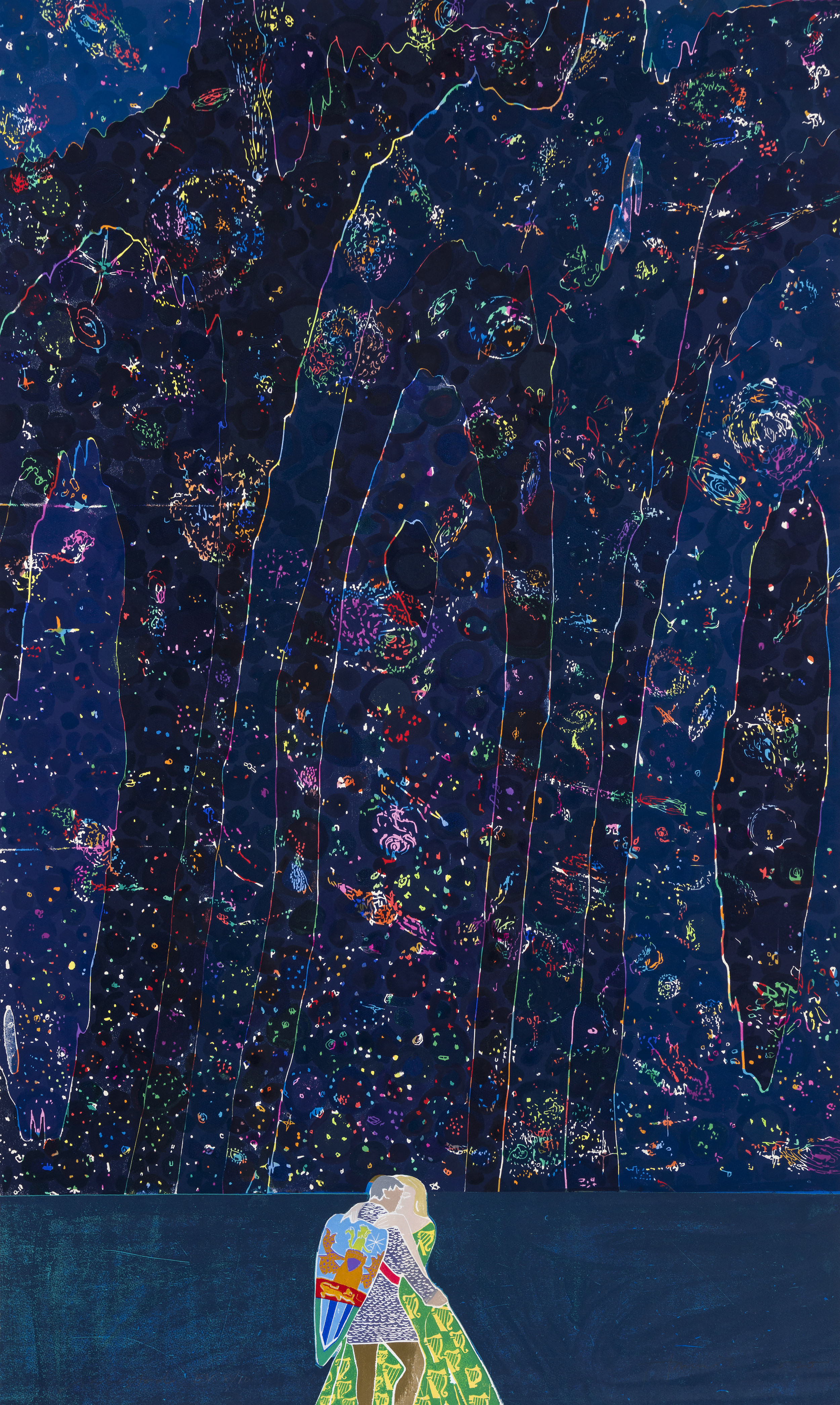 This hand painted woodcut, called Liebestod, has been made to celebrate Glyndebourne's 2021 magical revival of Wagner's Tristan und Isolde. In this image of the "unending sky" I have tried to find a pictorial equivalent of what Isolde sings about in her Liebestod aria at the end of the opera - i.e her and Tristan's corporeal connection to the far reaches of the universe as stardust. –TH