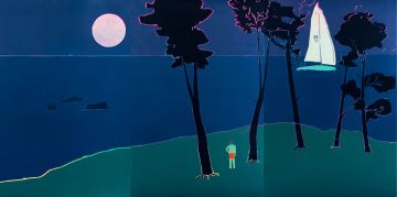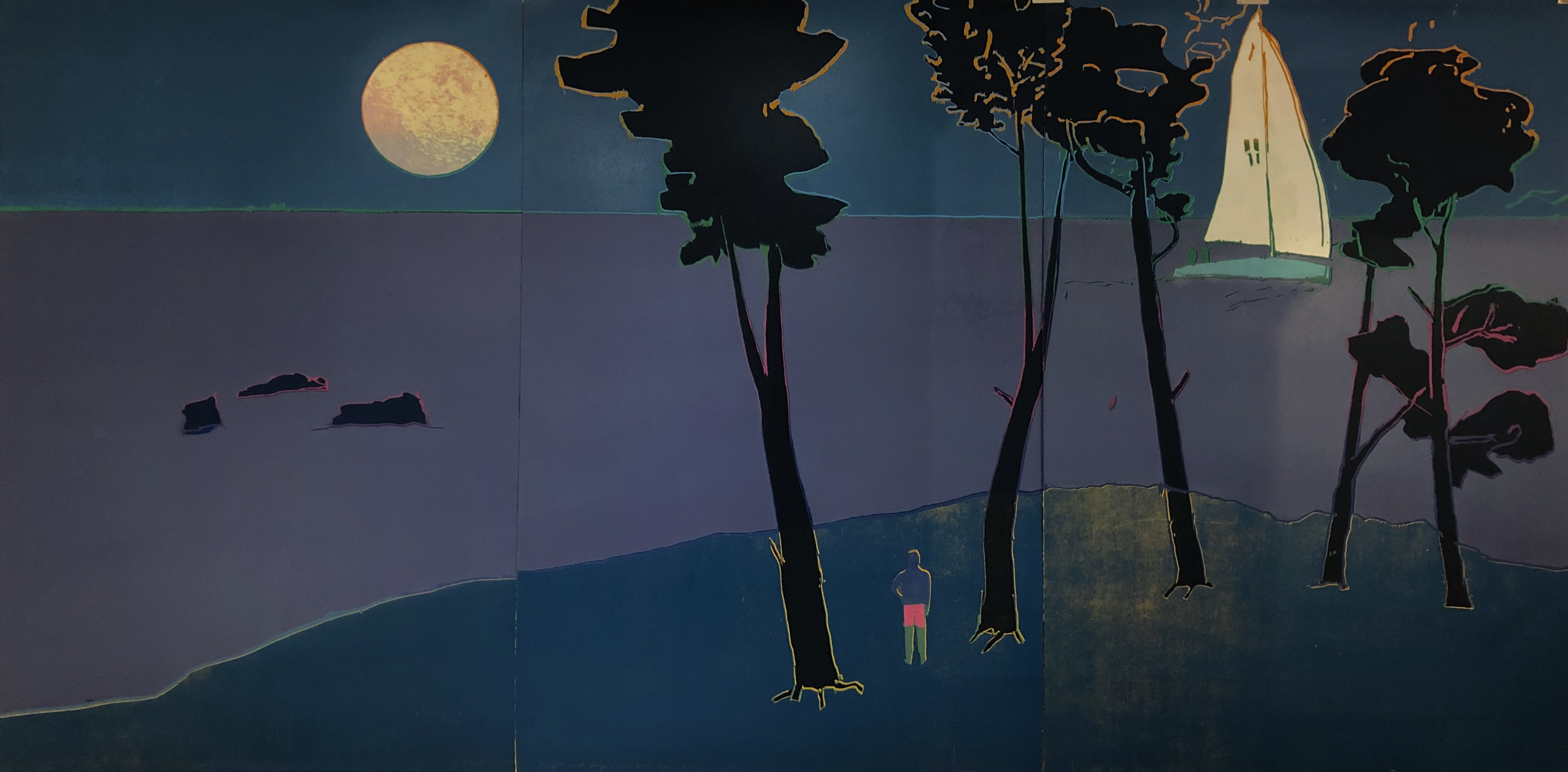 Night and Day started off as a drawing while on holiday in Greece when a friend sailed past in his spaceship-like sailing boat, which, when it came into the bay completely changed the scale of the surroundings. I wanted to make the figure very small in this vast triptych to emphasize his loneliness and to push and pull the space.