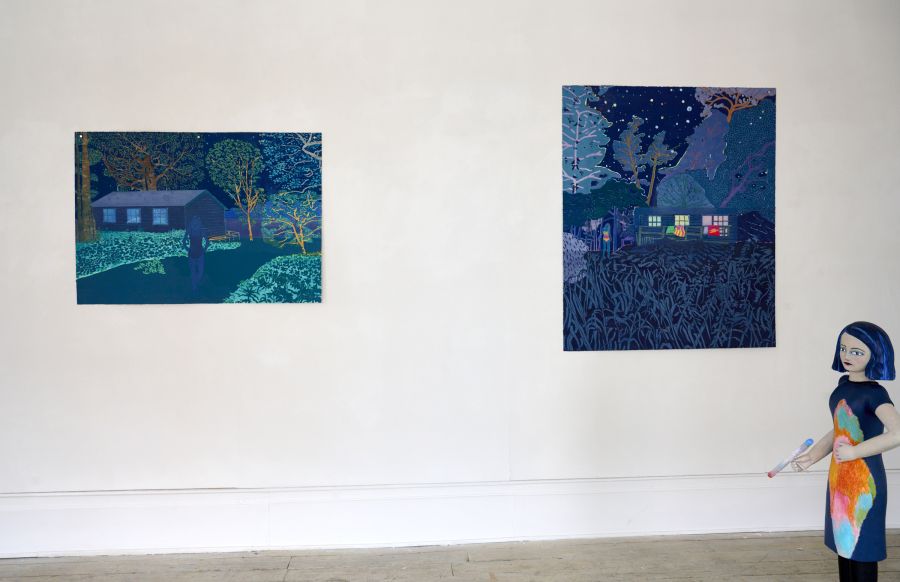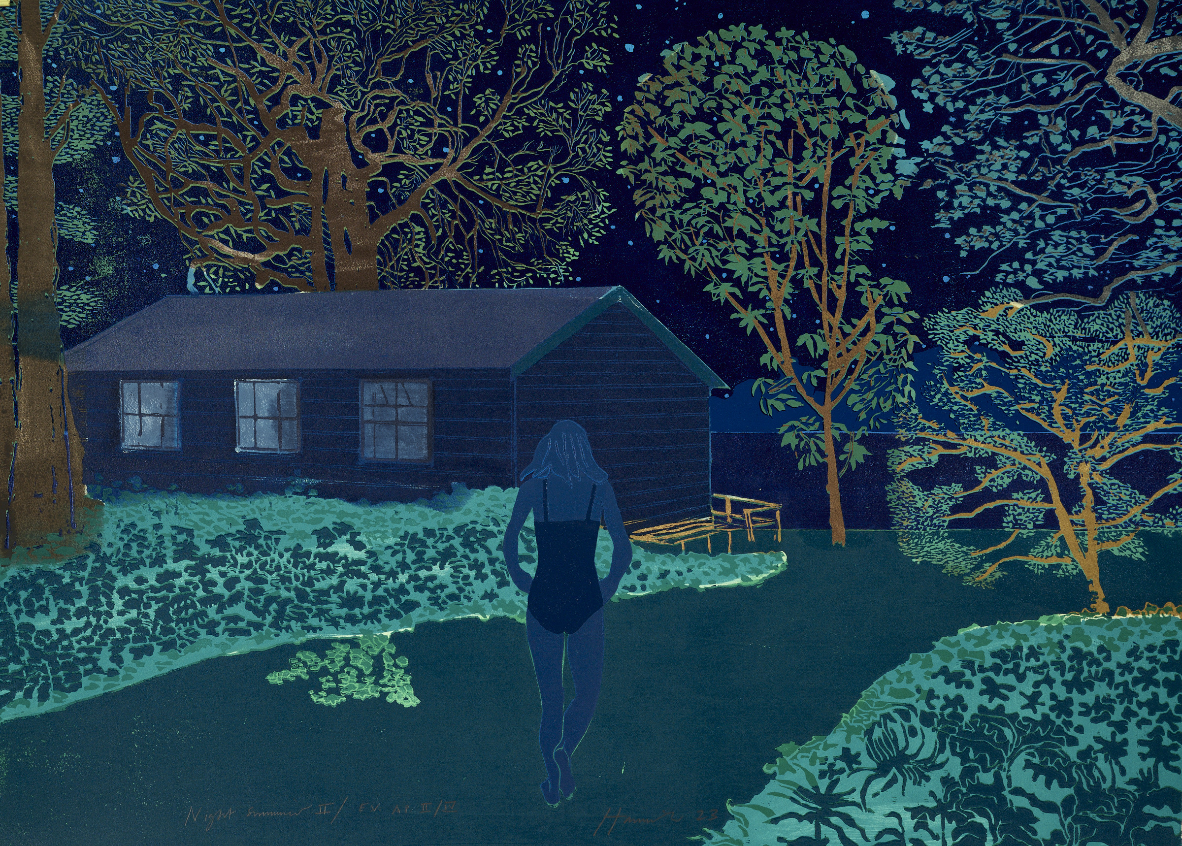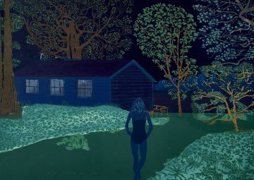 Here is a woodcut of Sidsel in Norfolk, walking on the woodland path down to The Broad at night, past the bathing shack. She is full of purpose, calm and perfectly happy in her element, despite the dark of the looming water.The borders of undergrowth lit up in the moonlight were conjured up by looking at late medieval tapestries in The V&A and The Kunsthistorisches Museum in Vienna the previous summer - TH