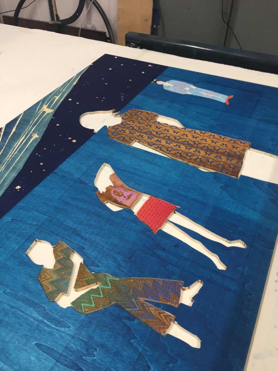 After the sterility of space I tried to use simple patterned fabrics on each figure as a metaphor for how sophisticated life on earth really is; a Missoni jumpsuit, a rather mumsy Heals fabric straight from the early 70’s, a Shepard Fairey iconic image of a refugee used in Obama’s re-election campaign and a Jean Paul Gaultier camouflage suit.