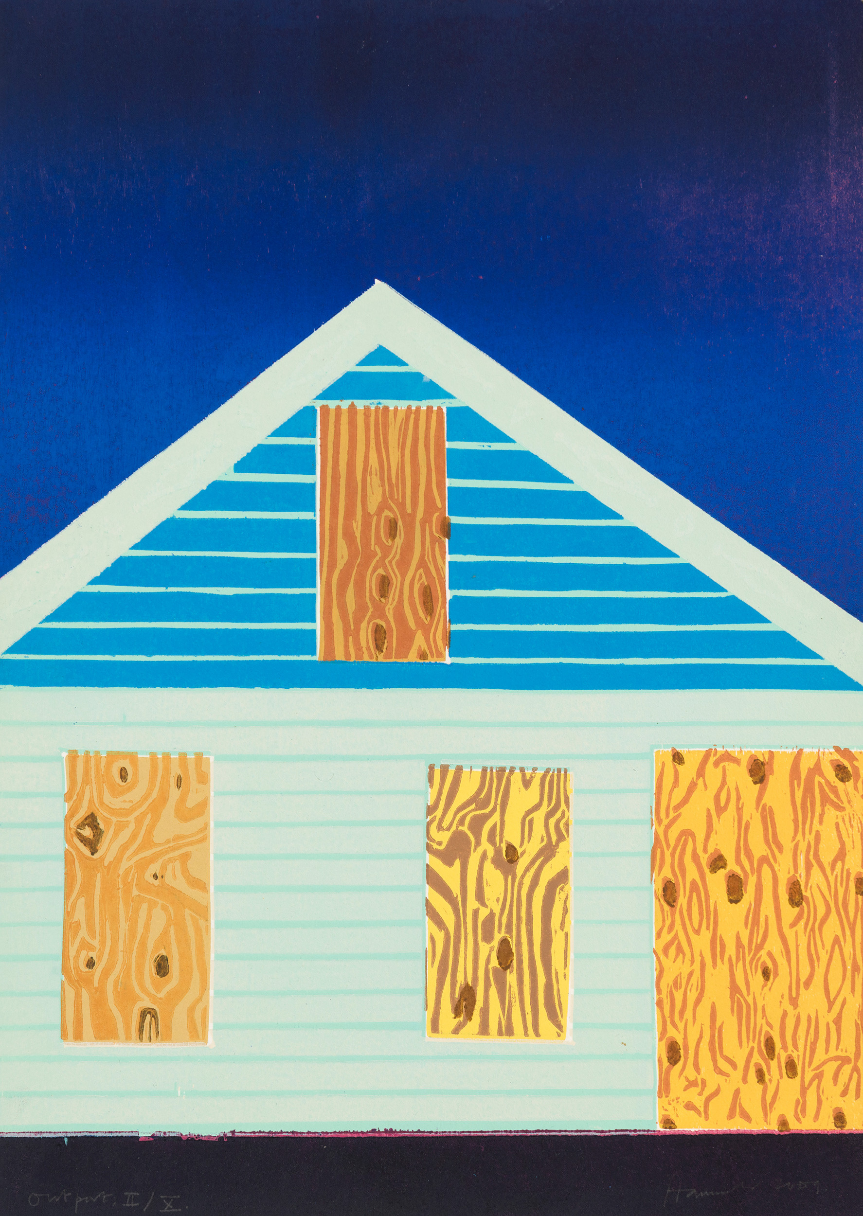 Outport was made after seeing some images of boarded up sub-prime houses in North America. Though a common sight in rural communities in Newfoundland, it was shocking to see so many suburban houses boarded up like this. I was also trying to make a counterpoint to some recent paintings like the one reproduced here – of houses all lit up and full of life.