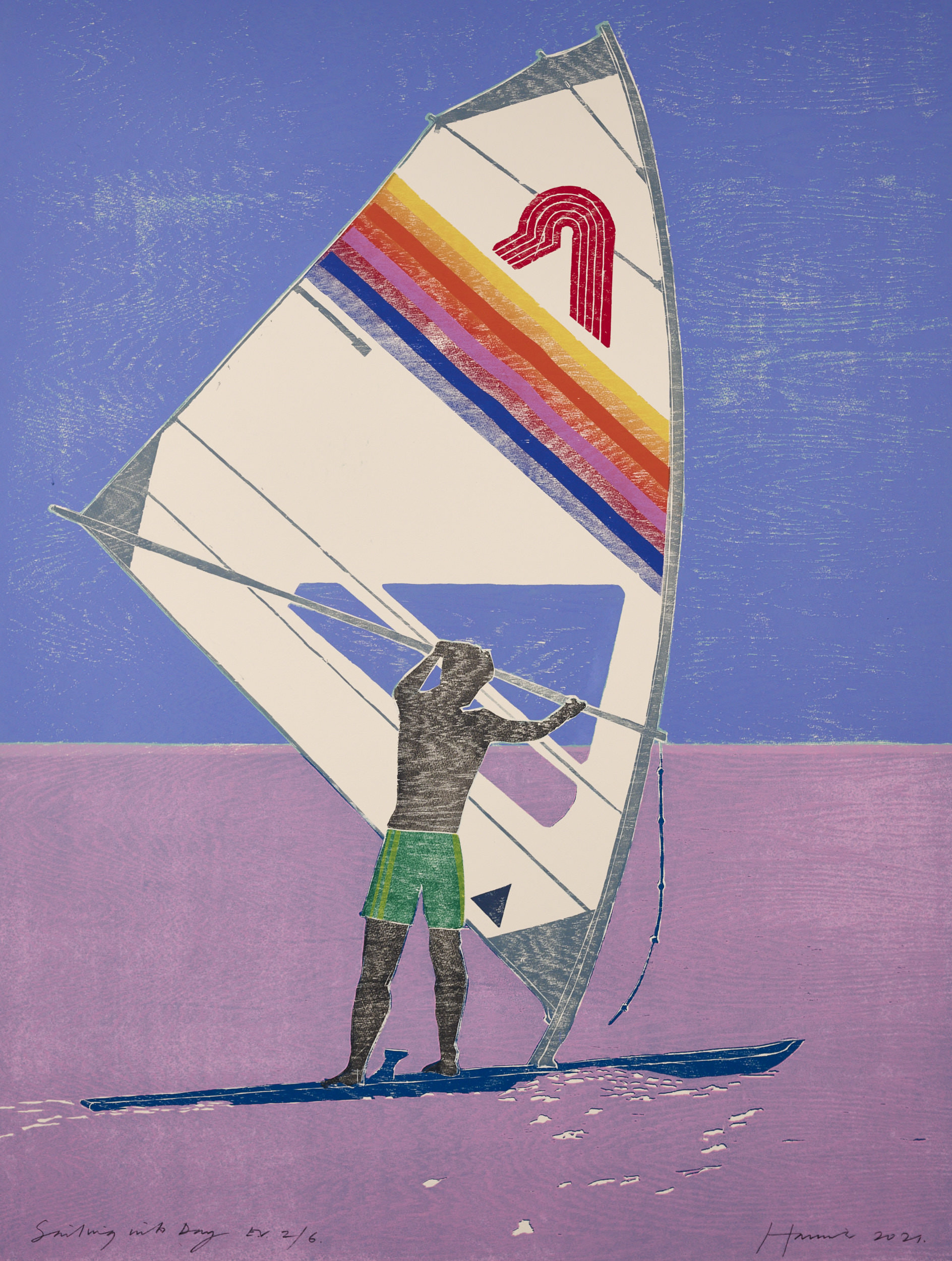 Sailing Into Day and Night are made in tiny variable editions of 6 with the coloured set, Sailing Into Day further sub divided into twos according to the background. When I first noticed wind surfing in the 80's I adored the movement of their coloured sails set against the flatness of sea and sky. Sails these days have changed remarkably but I was remembering how inflexible these vast booms were especially at a time when one was learning. In this image I hope I have conveyed the precariousness of the early learner almost as a metaphor for my generation with children seeing their offspring going out into the world - TH