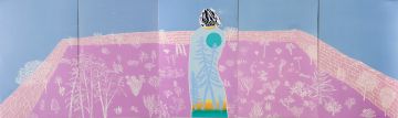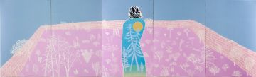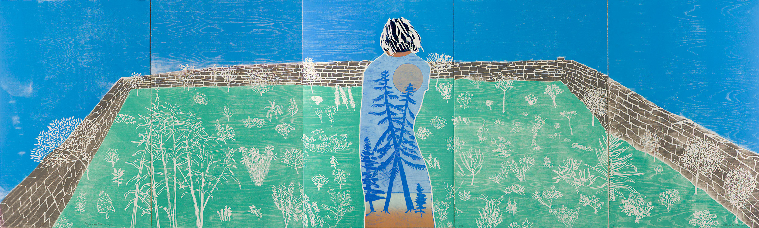 Sky Garden is a monumental woodcut in five panels. Oak panel was used to emphasise the grain of the print. A central figure, seen from behind, looks down on a miniature walled garden full of weed-like plants, reminiscent of verdant foregrounds seen in Northern Renaissance paintings and of an idiosyncratic Japanese garden. Pictorially, Sky Garden also conjures up the arrangement of organic forms on a flat picture plain found in Matisse's late cutouts.