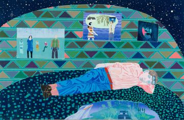 The carpet below him; where he sees an earlier version of his voyage, leaving a pre-lapsarian eden; was inspired by Roger Livesey’s characters camera obscura in a Matter of Life and Death. Looking back on this wood-cut two years on I realise that I used colours (browns, aubergines, umbres, mustard yellows) that strangely hot-wire me back to my childhood back in the 70s. In this image everything is in his head; the dreams, the spaceship, memories of loved-ones, and what’s more all of this comes from my head. Like the cyclical nature of the composition my dreams are his dreams and his dreams are my dreams.