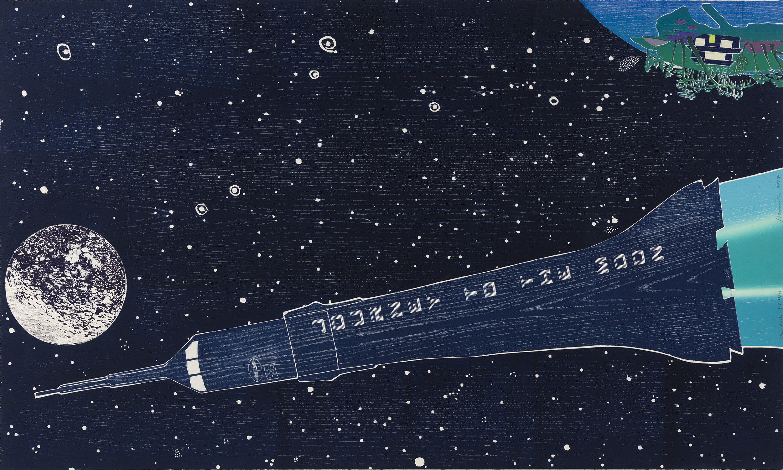 Star Path has separate jigsawed woodcut pieces with laser cutting and hang painting. In this woodcut I wanted the rocket to be a bit like The Flying Dutchman, stealing into space. We started off with the flume of the engines coming out red, orange and yellow but it was all too noisy. I was trying for as much silence as possible, like in some shots of of the revolving space station in Kubrick's 2001 A Space Odyssey and the stillness of Tarkovsky's panoramic scenes in Solaris. We arranged the image to be horizontal and upside down (positioning Earth above the craft and not below) to try to show the vacuum of space as weightless. As the ship starts to approach the gravitational pull of our beautiful but sterile moon, I hope the inkling of approaching lunacy, might be hinted at, with our verdant planet being left behind. The rocket and surrounding stars in the cosmos were cut from two different plates of oak veneer, so the grain helped emphasise two varying spaces within the image, despite Prussian and indigo blues being the blending colour across the plane - TH