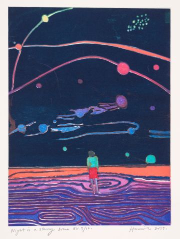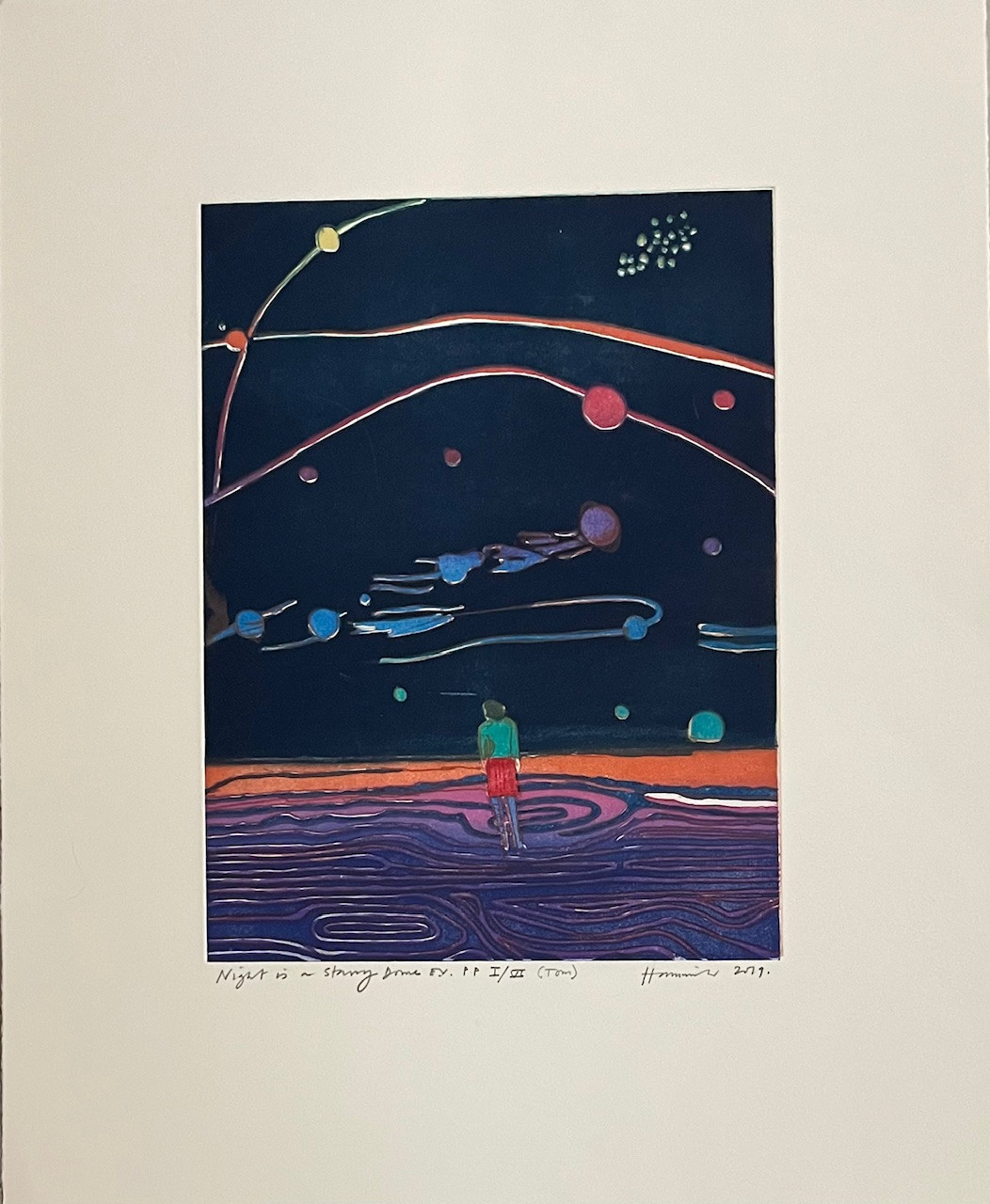 This etching visually is very influenced by the heavy grained woodcut. The standing figure is surrounded by mysteron-light shapes which are reminiscent of knots found in wood grain. There are two sorts of time going on here; the slow turn of the universe and the faster terrestrial pain of love and loss in our every day life. – TH