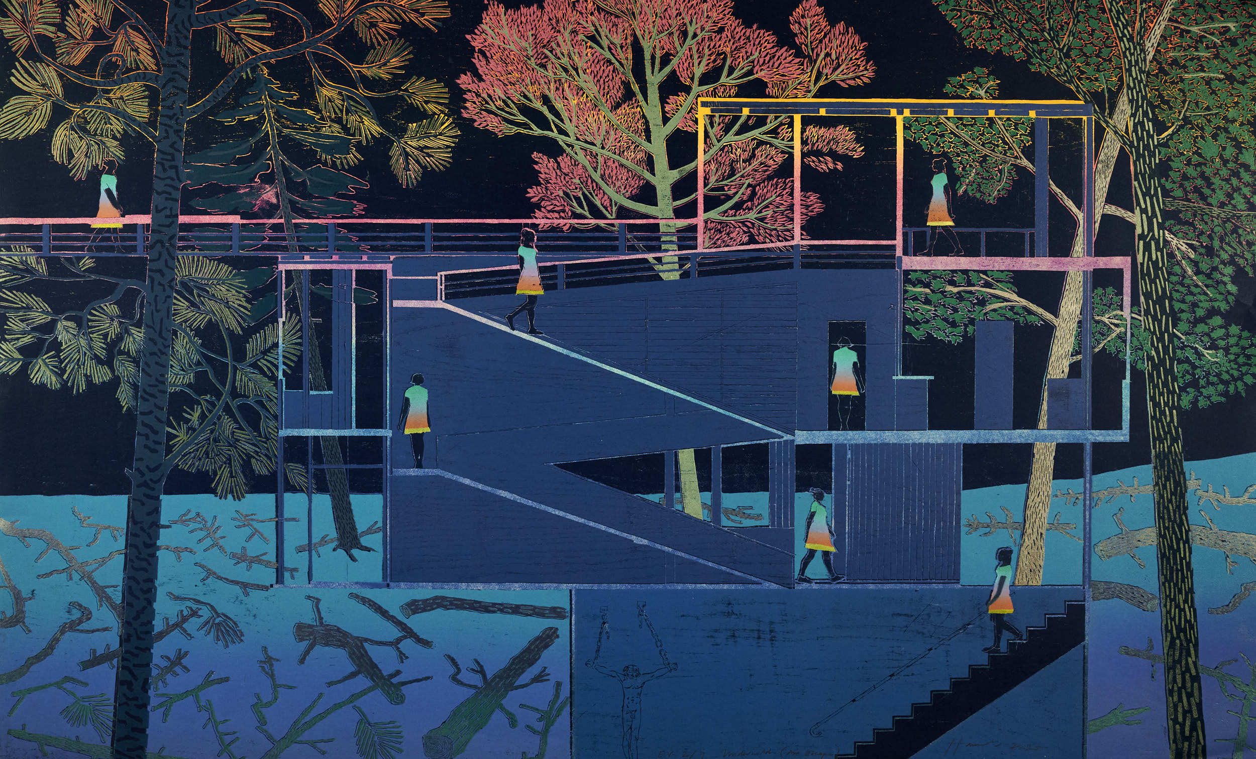 Underworld (An Escape) was inspired by the narrative and music in Beethoven's Fidelio which is returning to Glyndebourne in The Festival Tour in 2021. It was about the most complicated and layered woodcut we have made to date in the studio and started off with an idea involving an image that incorporated a modernist building as a prison(as a metaphor for the brutality of the state) set on the slopes of an autumnal forest (as an alternating metaphor representing hope, joy and the self correcting spirit of the people). The schematic of the prison was taken from a drawing in silhouette of Le Corbusier's Villa Savoie. I had also just watched Parasite and was very interested in the way the building was used as a motif that spanned experiences of heaven and hell within it's own vertical footprint. The arrangement of seven versions of Leonora acting as Fidelio, descending into the basement, to rescue her beloved Floristan was informed by the way that some quattrocento painters repeated the same figure within a picture as a way of conjuring up movement and alluding to the turning of time; two famous examples are Masaccio's Tribute Money in The Brancacci Chapel in Florence where Peter reappears several times within the drama of the image; the other is found closer to home in The National Gallery where within Giovanni di Paulo's St John the Baptist retiring to the Desert we experience the prophet striding out of a crenellated house in his pink tunic and without diminishing in scale walks into a cleft in the mountains. Technically this woodcut was a nightmare! When you are printing to this scale we always encounter paper stretch. The key was to off register each inked layer through the press so that we could even out the mis registration of the detail as it passed underneath the roller. Eventually we had to carve out everything but the leaves in the trees, trying not to make mistakes. This took us days working in close proximity wearing masks in lockdown. - TH